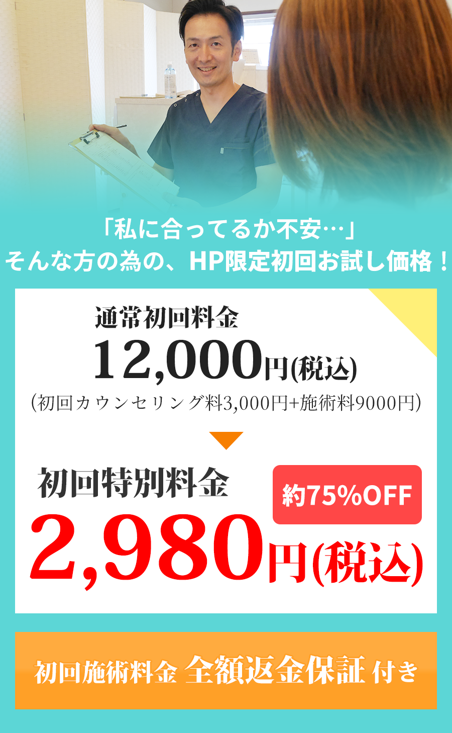 初回の施術で効果を実感できなければ、初回施術費を全額返金します。