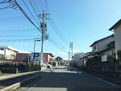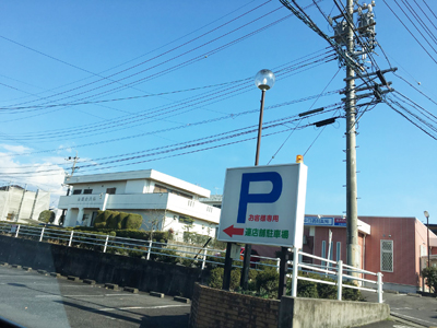 少し坂を登ると「P」と書いてある大きい看板がありますので、こちらに入って来て下さい。