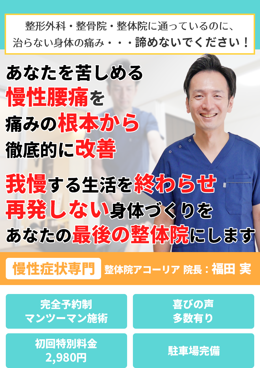 もしあなたが今ほんの少しでも心のどこかで良くなりたい!と思われているなら「整体院アコーリア」に来院し、そのつらい身体の痛みの根本を改善しませんか?