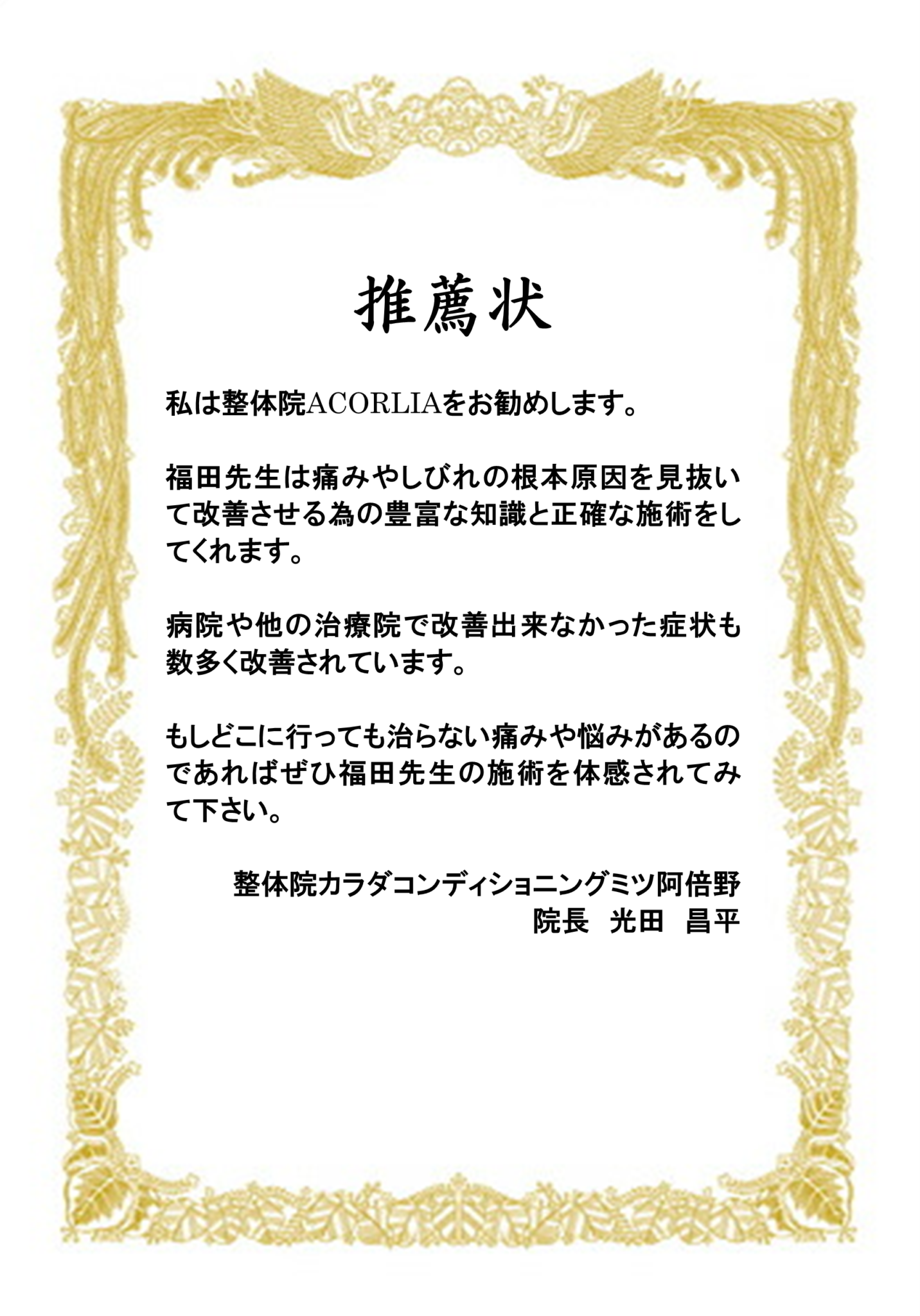 病院に2年くらい通院しても痛みが変わらなかったので、インターネットで検索して色々なところを調べていたら整体院アコーリアさんを見つけました。